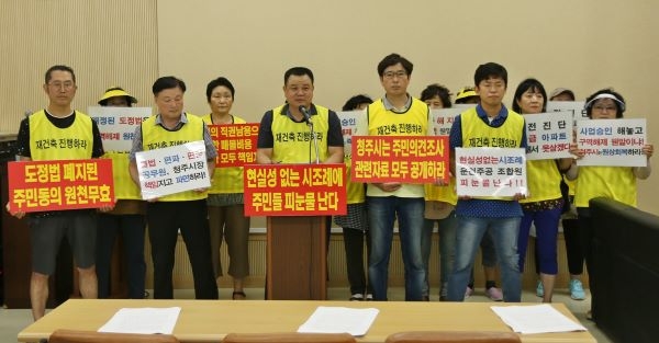 운천주공재건축정상화대책위원회가 지난달 30일 충북 청주시청 브리핑룸에서정비구역 해제 절차 무효화를 주장하고 있다. 사진=뉴시스