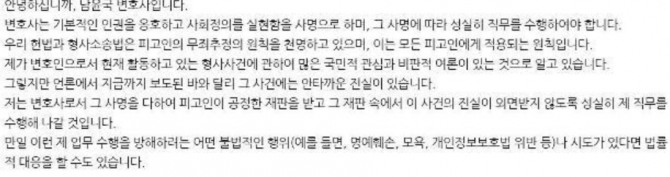 저는 변호사로서 그 사명을 다하여 피고인이 공정한 재판을 받고 그 재판 속에서 이 사건의 진실이 외면받지 않도록 성실히 제 직무를 수행해 나갈 것입니다.
