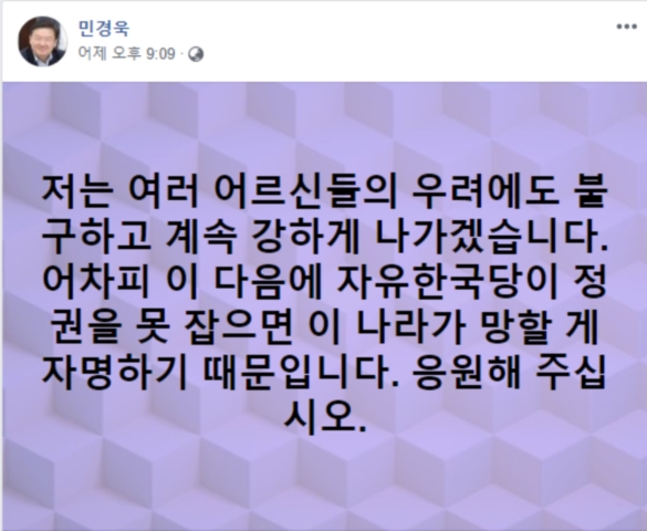 이미지 확대보기민경욱 자유한국당 의원이 “어차피 이 다음에 자유한국당이 정권을 못 잡으면 이 나라가 망할 게 자명하기 때문입니다”라며 “우리도 정권 잡으면 과거사진상규명특위를 만들어야 하지 않겠습니까?”라는 글을 16일 자신의 페이스북에 올렸다.