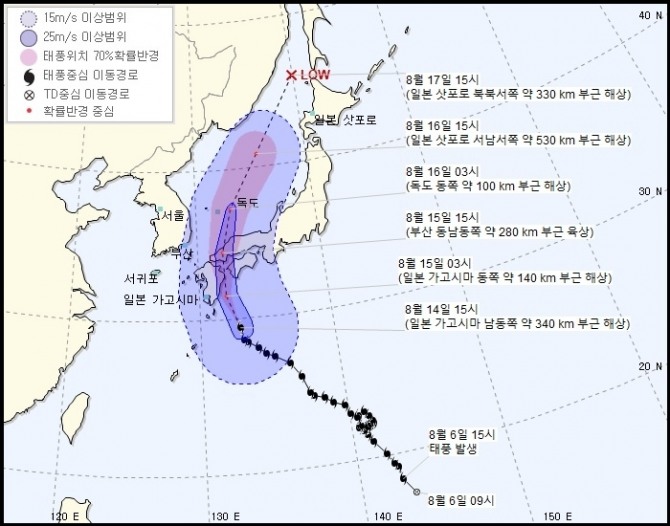 일본 가고시마, 오사카를 거쳐 부산이 아닌 독도를 향할 것으로 예측됐다. 경북·경남해안 최대 100㎜이다.