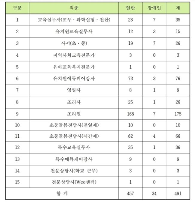 채용규모는 교육실무사를 포함해 유치원 에듀케어강사, 조리원 등 15개 직종 총 491명이며, 그 중에서 34명은 장애인으로 채용할 계획이다.