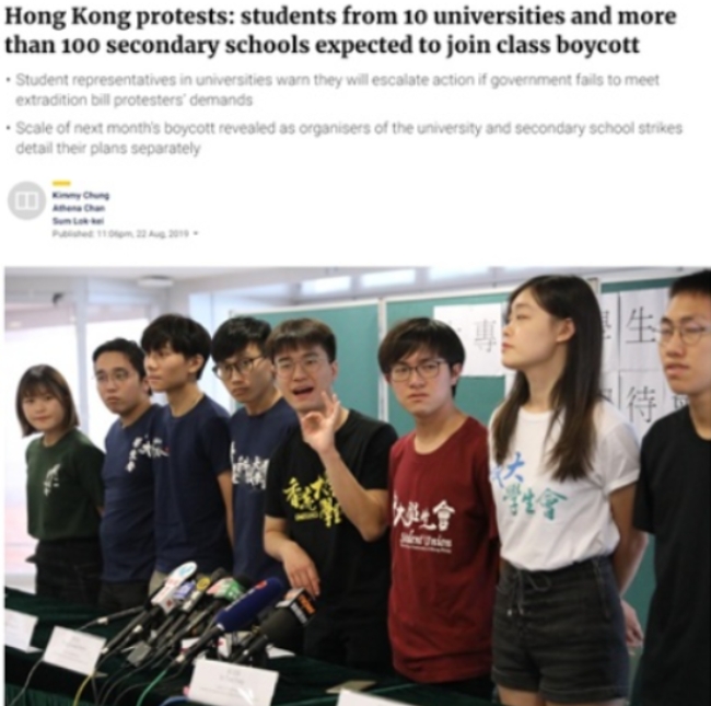 9월부터 새 학기를 맞은 홍콩에서 ‘범죄인 인도’ 조례개정안의 완전철회 등을 요구하는 대학생과 중·고교생의 그룹이 수업을 보이콧한다고 말했다. 교사들도 이 움직임을 지원하는 반면 홍콩정부는 성명을 통해 학습기회가 박탈된다며 반발하고 있다. 여름휴가 막바지에 접어든 홍콩의 새 학기는 파행의 시작이 될 것으로 보인다.