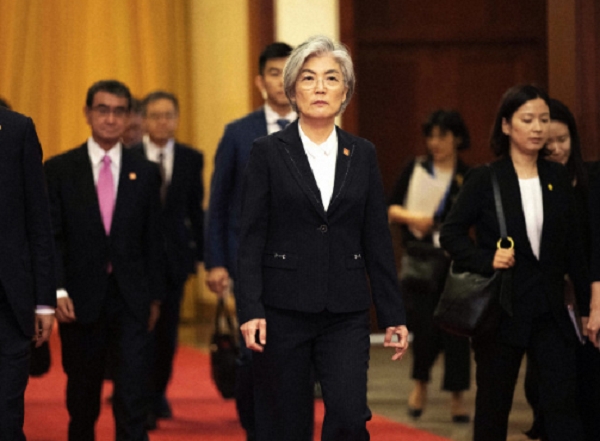 중국 베이징에서 리커창 중국총리와 면담하기 위해 자리를 옮기는 강경화 한국 외무장관(가운데)과 고노 다로 일본 외무상(왼쪽).사진=AP/뉴시스
