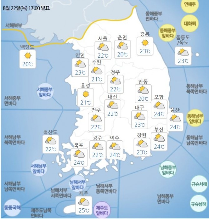 주요 지역 예상 아침 기온은 ▲서울 22도 ▲인천 23도 ▲수원 21도 ▲춘천 20도 ▲강릉 23도 ▲청주 22도 ▲대전 22도 ▲전주 22도 ▲광주 22도 ▲대구 23도 ▲부산 24도 ▲제주 25도다.