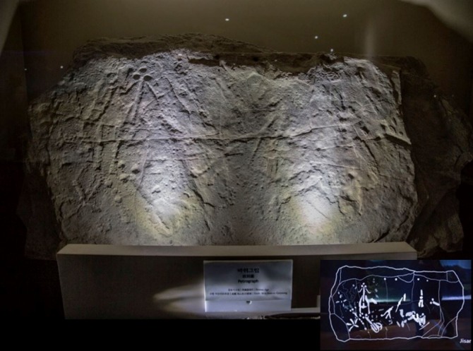 주석실 개석 암각화의 경우, 주석실 개석의 크기는 두께 11㎝, 폭 120㎝ 정도이다. 암각의 기본 형태는 위쪽이 넓고 아래가 좁은 신면형으로, 장기리와 안화리의 것과 비슷하다. 완전한 모양이 아니라 상하의 일부가 잘려나가 전체의 3/4 정도만 형태가 남아 있다.