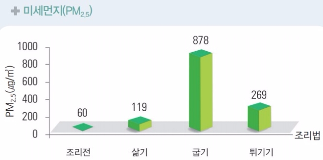 조리법별로 발생정도도 다르다. 발생빈도는 삶는 요리보다 기름을 사용하는 굽기나 튀김요리가 높다. 평소 미세먼지 농도보다 최소 2배에서 최대 60배 높게 생성된다.