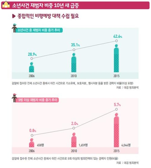 갈수록 소년사건 재범율이 높아지는 것도 문제다. 대검찰청 범죄 분석 통계에 따르면 2006년 28.9%에 불과했던 소년사건 재범율은 10년 새 42.6%로 증가했다.