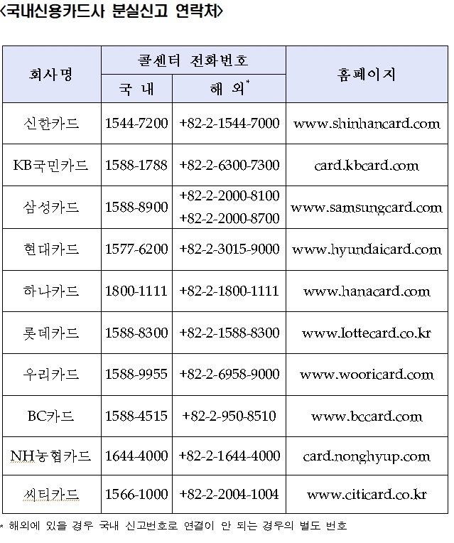 해외여행 중 신용카드 결제내역을 확인할 수 있도록 ‘결제 알림문자서비스(SMS)’를 신청하고, 도난·분실시 연락 가능한 카드사의 분실신고센터 연락처도 준비하면 좋다.