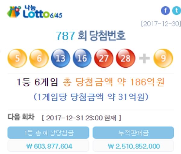 한편 787회 나눔로또 당첨번호는 ‘5, 6, 13, 16, 27, 28’이 1등 당첨번호로 뽑혔다. 2등 보너스 번호는 ‘9’였다.