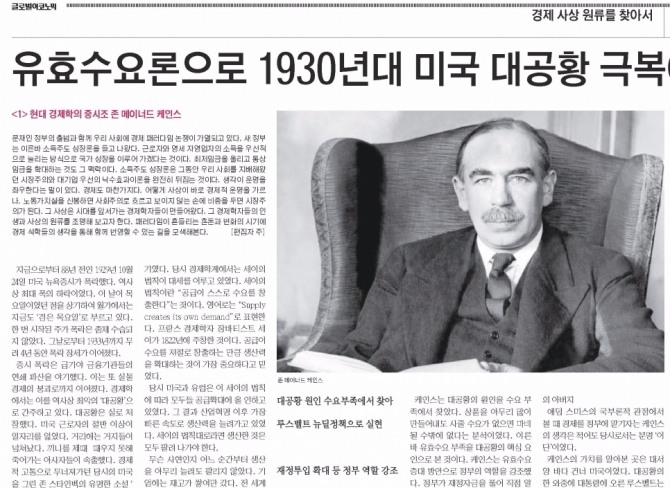 케인스는 대공황의 원인을 수요부족에서 찾았다. 상품을 아무리 많이 만들어내도 사줄 수요가 없으면 마비될 수밖에 다는 분석이었다. 이른바 유효수요 부족을 대공황의 핵심 요인으로 본 것이다. 케인스는 유효수요 증대 방안으로 정부의 역할을 강조했다. 정부가 재정자금을 풀어 직접 일자리를 만드는 방법으로 소비 수요를 늘려야 한다는 것 이었다.