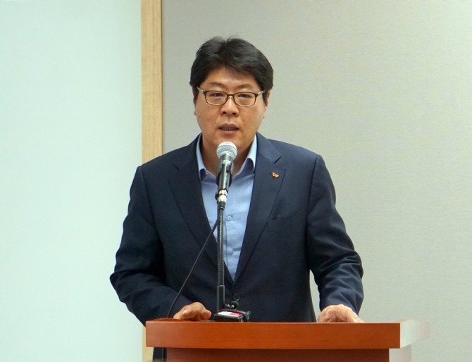 이준호 SK텔레콤 SV 추진그룹장이 22일 열린 간담회에서 'ICT 돌봄 서비스'에 대해 설명하고 있다. (사진=최지웅 기자)
