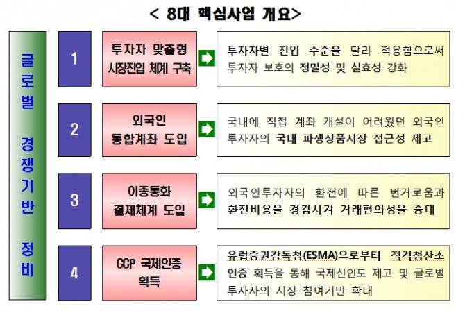 올해 상반기에 TR 도입방안을 확정하고, 하반기에는 시스템 개발에 착수하여 늦어도 2017년 상반기 중 시범운영할 예정이다. 이밖에도 외국인 통합계좌 도입, 이종통화(미국 달러) 결제체계 구축 등 글로벌 스탠더드 수준으로 규제완화를 단행, 글로벌 경쟁력확보 외인투자자 유치에도 발벗고 나설 계획이다.
