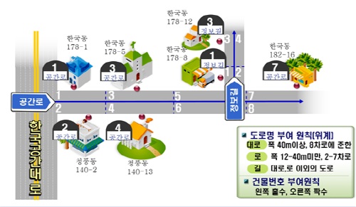 도로명주소란 무엇인가? 말 그대로 도로에는 도로이름을, 건물에는 체계적인 번호를 부여하는 주소방식이다. 40m 이상의 도로는 ‘대로’, 12~40m 미만은 ‘로’, 이외 도로는 ‘길’로 구분한다. ‘대로’와 ‘로’급 구간은 역사적이고 특징적인 고유명사의 도로명을 사용한다. 또한 도로의 시작과 끝의 기준은 서쪽에서 동쪽으로, 남쪽에서 북쪽으로 적용하고 있으며, 건물번호는 20m 간격으로 왼쪽은 홀수, 오른쪽은 짝수를 부여한다. 명확한 기준과 그 일관성이 큰 강점이라 할 수 있다.