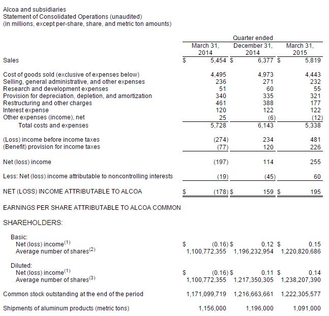 Alcoa reported first quarter 2015 net income of $195 million, or $0.14 per share, including $158 million in restructuring-related charges (approximately 90 percent non-cash), mostly to optimize the Company's portfolio. Year-over-year, first quarter 2015 results compare to a net loss of $178 million, or $0.16 per share.