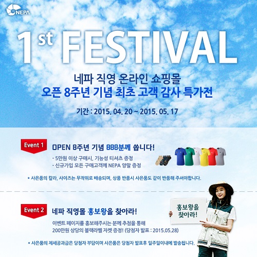 네파는 고객 감사 특가전 외에도 다양한 이벤트도 마련했다. 직영몰 오픈 8주년을 기념해 ‘888분께 쏩니다’라는 주제로 5만 원 이상 구매 고객 선착순 888명에게 기능성 티셔츠를 증정한다. 직영몰에 신규 가입한 구매 고객 선착순 888명에게는 네파 양말을 제공한다.