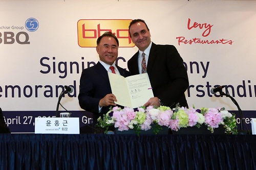 이미지 확대보기27일 삼성동 그랜드 인터콘티넨털 호텔에서 제너시스 비비큐와 세계적인 외식사업 업체인 캠패스그룹의 레비(Levy) 사(社)와 업무 협약(MOU)을 맺었다.
