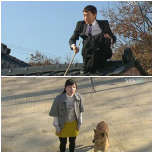 지붕위에 쪼그리고 앉아 불쌍한 표정을 한 채 긴 작대기로 개를 쫓아내는 '굴욕'모습이 가관. 그의 노력에도 불구 진돌이는 지붕아래서 사납게 짖어댔다.