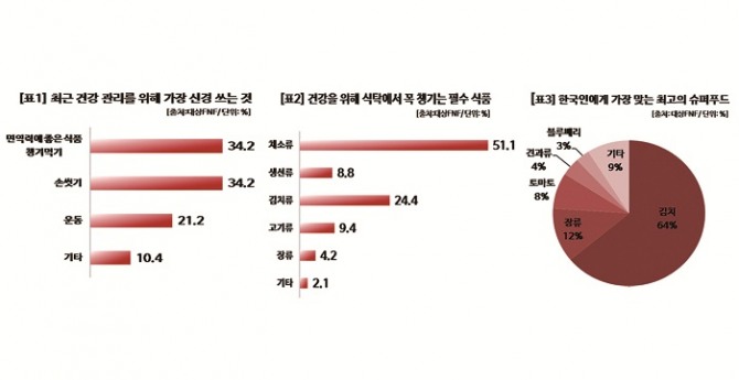 '건강을 위해 식탁에서 꼭 챙기는 필수 식품'이란 질문에는 응답자의 절반 이상이 채소류(51.1%)를 꼽았다. 김치류(24.4%), 고기류(9.4%), 생선류(8.8%) 순이었다.