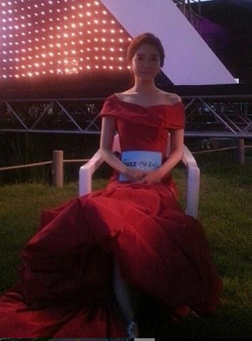 사진 속에서 김소영 아나운서는 붉은 롱 드레스를 입고 다소곳이 의자에 앉아있다.