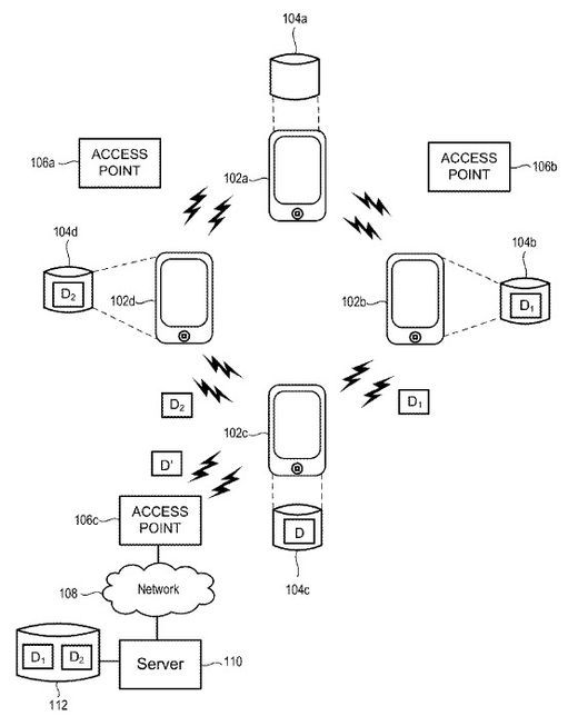 이 특허는 무선LAN(Wi-Fi)이나 블루투스, NFC(근거리 무선통신) 등으로 근처에 있는 다른 단말기에 직접 연결해 자신의 데이터를 단말기에 백업하는 기술이다. 즉 자신의 아이폰 공간이 부족할 때 친구의 여유 공간이 빌린다는 개념이다.