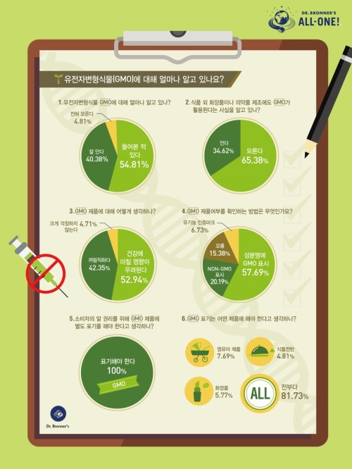 이미지 확대보기미국 유기농 스킨케어 브랜드 닥터 브로너스는 자사 공식 페이스북을 통해 성인남녀 104명을 대상으로 진행한 ‘소비자 GMO 인식 실태’ 설문 결과에 따르면, 전체 응답자의 절반 이상인 54.81%가 GMO에 대해 들어본 적 있다 답했다고 11일 밝혔다.