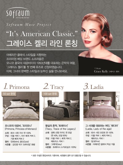 소프라움 유광곤 부문장은 “새롭게 론칭되는 그레이스 켈리 라인은 2015년 하반기부터 시작하는 ‘소프라움 뮤즈 프로젝트’의 일환”이라며, “아메리칸 클래식 스타일을 지향하는 프리미엄 브랜드인 소프라움을 보여줄 수 있는 대표적인 뮤즈를 고심한 가운데, 모나코 왕국의 대공비이자 1950년대를 대표하는 당대 최고의 영화배우인 ‘그레이스 켈리’를 첫 번째로 선정하게 됐다”고 전했다.