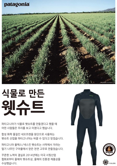 한편 파타고니아 율렉스 웻슈트는 사막에서 자라는 떨기 나무인 구아율에서 얻은 천연 고무로 만든 웻슈트로서 2014년 미국 서핑산업협회에서 뽑은 올해의 웻슈트상, 올해의 친환경 제품상을 수상했다.