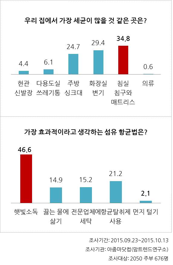 그 결과 주부들이 집안에서 세균이 가장 많다고 생각하는 곳으로 '침구와 매트리스(34.8%)'가 1위를 차지했다. 이는 '화장실 변기(29.4%)'와 '주방 싱크대(24.7%)'를 선택한 경우보다 더 많았다. 주부들이 평소 집안 섬유 제품에 세균이 많다고 생각하는 것으로 나타났다.