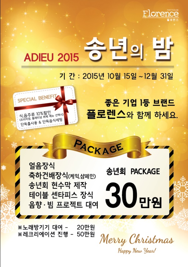 플로렌스 측에 따르면, 이번 기업송년회 패키지는 얼음장식과 축하건배장식, 송년회 현수막, 테이블센타피스장식, 음향장비, 빔프로젝트 대여 등 행사 진행에 필요한 모든 서비스를 총 30만 원이라는 합리적인 비용으로 진행할 수 있도록 구성했다. 추가 선택 사항으로 노래방기기 대여와 레크리에이션 진행도 마련돼 있다.