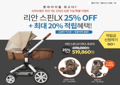 이번 롯데아이몰 슈퍼 브랜드 위크는 2015년 롯데아이몰에서 판매하며 가장 인기가 높았던 각분야 최고의 브랜드들을 모아, 최다 할인혜택과 함께 포인트까지 제공하는 프로모션이다. 이 기간 리안은 인기 디럭스형 유모차인 '리안 스핀LX'를 25% 할인된 가격에 판매한다. 바구니형 카시트로 호환해 사용할 수 있는 '신생아용 인펀트 카시트'와 '방풍커버'를 특별 사은품으로 제공한다.