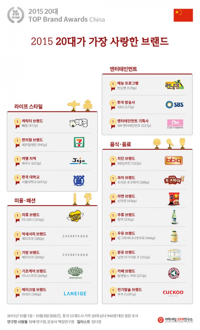 최근 한국의 20대에게 가장 사랑받는 브랜드를 조사해 발표한 대학내일20대연구소는 지난 10월1일부터 8일까지 중국 1‧2선 도시 20대 남녀 946명을 대상으로 한국의 제품과 서비스 브랜드 사용경험을 토대로 '중국 20대에게 사랑받는 한국의 탑브랜드'를 선정해 발표했다.