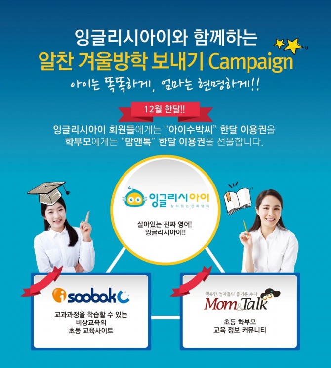 잉글리시아이는 ‘학생은 똑똑하게, 부모는 현명하게 알찬 겨울방학 보내기’ 캠페인의 일환으로, 12월 한 달간 모든 회원에게 초등 인터넷강의사이트 ‘아이수박씨’의 전 과목 자유 수강 상품 ‘아이패스’ 1개월 무료 이용권을 증정한다고 27일 밝혔다.