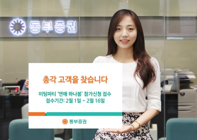 미팅파티 '연애 하나봄' 이벤트는 동부증권의 미혼 남성 고객을 대상으로 가연결혼정보에 등록된 여성 고객과 함께 무료로 미팅파티에 참가할 수 있는 행사로 참가를 희망하는 미혼 남성 고객은 동부증권 홈페이지 내 이벤트 페이지에서 이달 16일까지 참가 신청을 접수하면 된다.