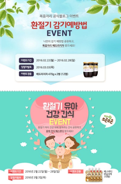 '복음자리'가 28일까지 '환절기 건강 관리법' 공유 이벤트를 진행한다. '환절기 감기 예방법' 이벤트는 나만의 감기 예방 노하우를 댓글로 작성하면 참여할 수 있다. 추첨을 통해 총 12명에게 '배도라지차(470g)' 2세트를 증정한다. '환절기 건강 간식' 이벤트는 건강하게 먹을 수 있는 유아 간식 레시피를 댓글로 작성하면 자동 응모된다. 모두 10명에게 '아기랑소곤소곤 배스무디' 4입세트를 제공한다.