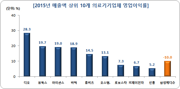 삼성메디슨은 매출 상위사 가운데 영업이익 적자를 기록했다. 이 회사의 적자 원인으로는 연구개발비가 꼽힌다. 지난해 연구개발비는 매출의 18.9% 수준인 506억원에 달했다.