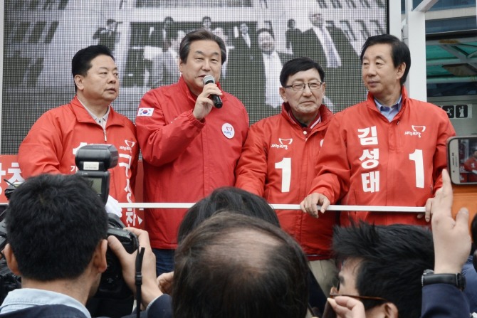 이미지 확대보기새누리당 김무성 대표가 7일 오전 서울 화곡역 앞에서 구상찬(왼쪽,강서갑), 김성태(강서을), 유영(오른쪽 두번째,강서병) 후보와 함께 출근길 시민들에게 한표를 호소하고 있다. / 사진 = 뉴시스