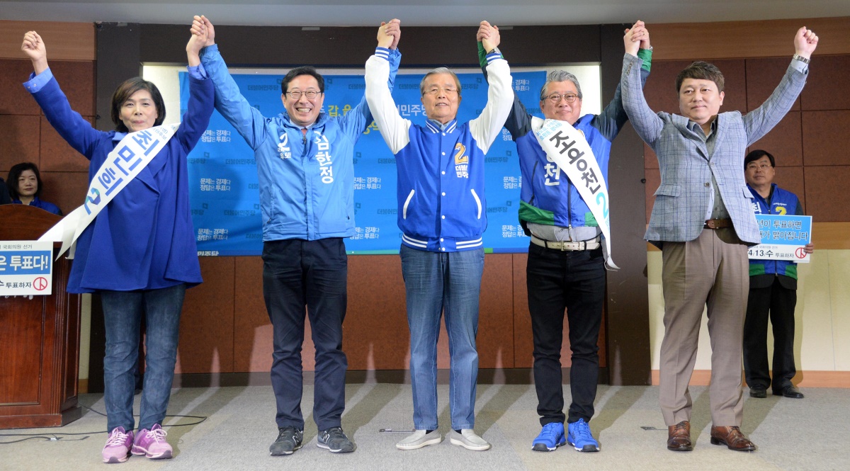 이미지 확대보기김종인 더불어민주당 비상대책위원회 대표가 7일 오전 경기 남양주시 경춘로 남양주시청에서 남양주갑 조응천(오른쪽 두번째), 남양주을 김한정(왼쪽 두번째), 남양주병 최민희(왼쪽) 후보 공동정책 공약 발표에 앞서 손을 맞잡아 들어올리고 있다. / 사진 = 뉴시스