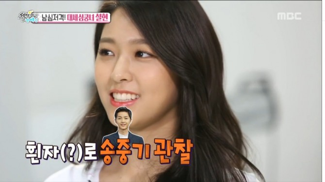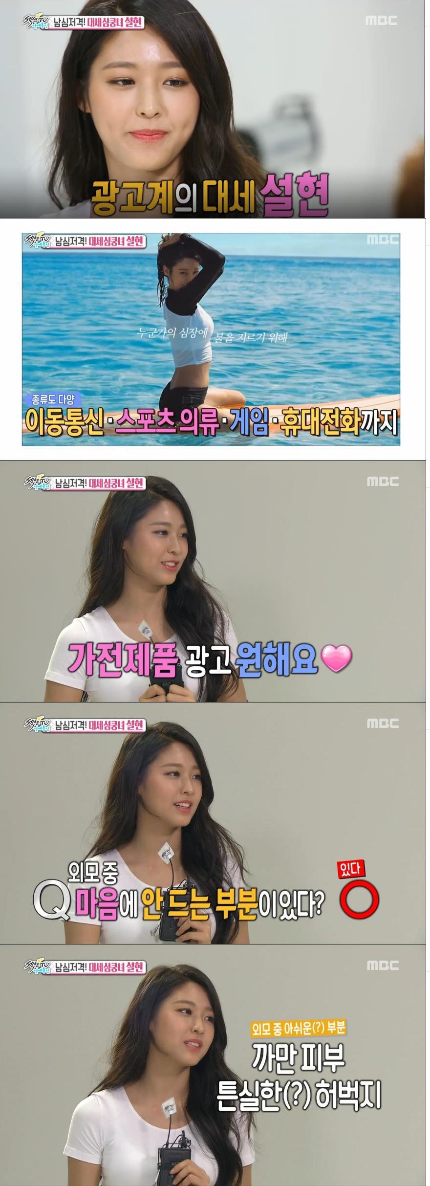 이미지 확대보기이어지는 '설현 집중 탐구 코너'를 통해 박슬기는 "자신의 마음에 안 드는 부분은 어느 곳인지?"라고 질문하자 설현은 "흰 피부를 원하는데 까만 피부에 튼실한 허벅지가 콤플렉스"라고 밝혔다. 설현은 또 자신의 얼굴비대칭을 꼽기도 했다.