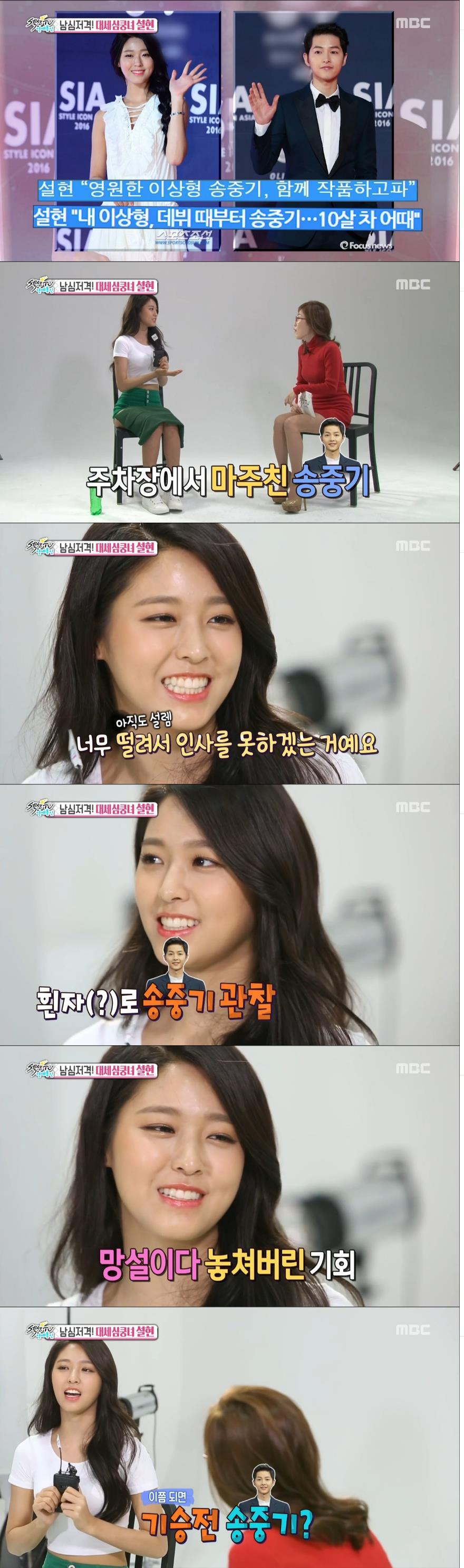 이미지 확대보기10일 방송된 MBC '섹션TV 연예통신'에서 광고계의 대세녀 설현은 박슬기와의 인터뷰를 통해 "송중기가 데뷔 때부터 이상형이었다며 10년째 중기앓이를 하고 있다"고 고백하며 화제를 모았다.