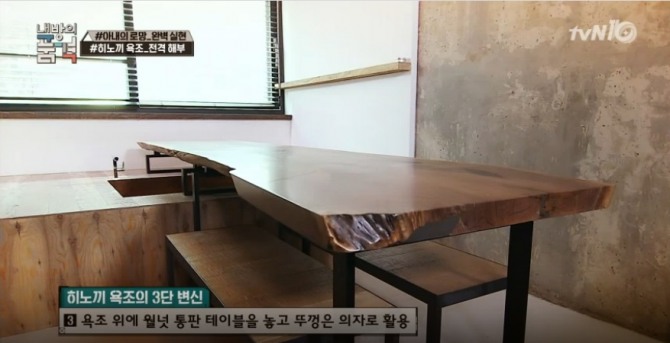 이때 오래된 목재(고목재) 느낌을 주기 위해서 일반 목재에 ‘목재 부식 처리 도료’(목재 구조를 변성시켜 오래된 느낌의 고재 풍으로 만들어 주는 도료)를 발라 전체적인 설치 비용을 줄였다고 자신만의 비법을 공개했다.