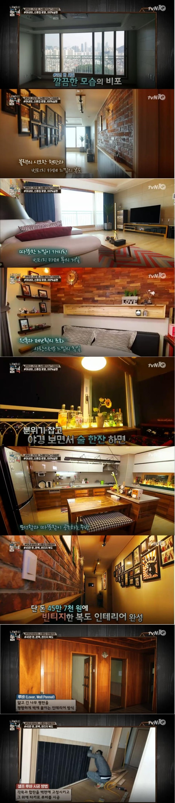 이미지 확대보기특히 복도 하부에 빈티지한 느낌을 더욱 살려주는 인테리어 아이템 루바(얅고 긴 나무 평판을 평행하게 벽에 붙이는 인테리어 방식)시공을 할 때는 각목과 합판을 벽면에 고정시키고 그 위에 타카로 시공해야 편리하고 튼튼하게 된다고 알렸다.