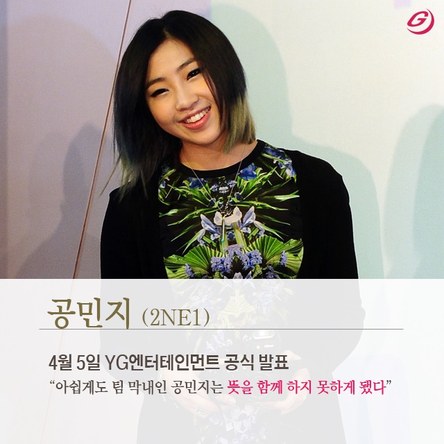 2주 전인 지난 5일에는 2NE1 공민지가 팀을 탈퇴했다. YG엔터테인먼트는 “멤버들과 각각 개별 면담을 통해 재계약 의사와 2NE1의 재도약에 대한 의지를 전달했습니다만, 아쉽게도 공민지 양은 뜻을 함께하지 못하게 됐다”고 전했다.