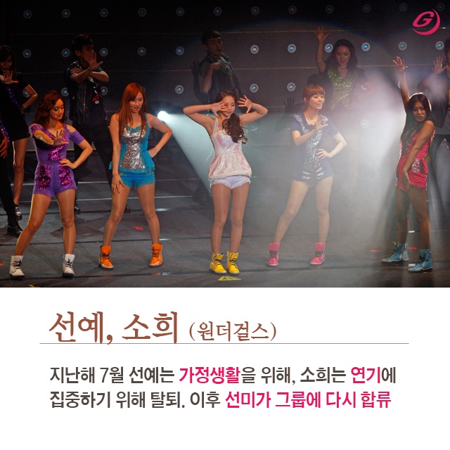 원더걸스의 선예와 소희도 지난해 그룹에서 탈퇴했다. 결혼과 출산을 한 선예는 가정생활을 위해, 소희는 연기에 집중하기 위해서였다. 이후 활동을 중단했다가 솔로 활동을 펼쳤던 선미가 다시 합류했다.