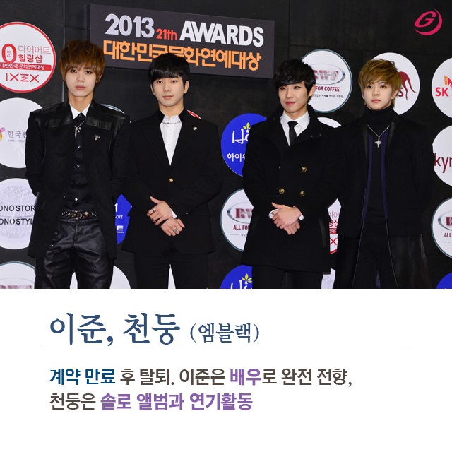 엠블랙 이준과 천둥은 계약이 만료되자 그룹을 탈퇴했다. 이준은 배우로 완전히 전향했고, 천둥은 솔로로 음악활동을 하며 연기에도 발을 넓히고 있다.