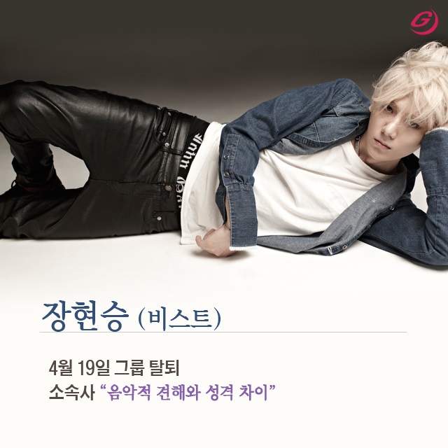지난 19일 장현승이 그룹 비스트에서 탈퇴했다. 소속사 큐브엔터테인먼트는 “장현승과 5인 멤버는 서로 다른 음악적 견해에서 시작된 성격 차이로 팀 활동에 대한 발전적 변화를 사측과 꾸준히 상담, 논의해왔다”며 심사숙고 끝에 서로 결별하기로 했다고 밝혔다.