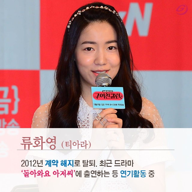 티아라 멤버였던 류화영은 2012년 계약이 해지되면서 탈퇴했다. 최근 드라마 ‘돌아와요 아저씨’에 출연하는 등 연기활동을 하고 있다.