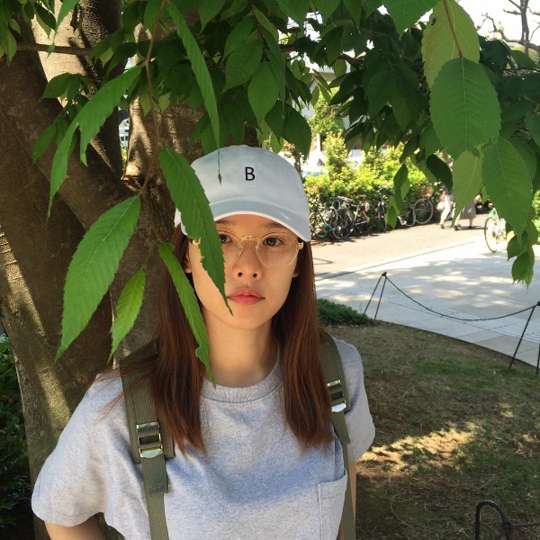 사진 속의 조윤희는 가벼운 메이크업을 한 채 커다란 안경을 끼고 모자를 쓴 캐주얼한 차림을 하고 있다.