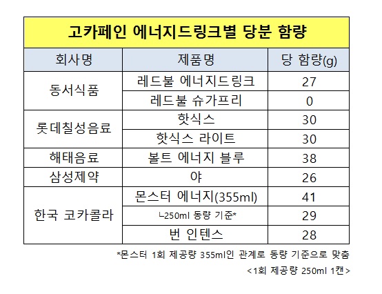 이 외에 한국 코카콜라 ‘번 인텐스’가 28g, 삼성제약의 '야'가 26g의 당이 각각 함유돼 있는 것으로 나타났다. 동서식품 레드볼의 경우 당이 27g이 들어있었으나 당이 0g인 슈가프리 제품을 제공하고 있다.