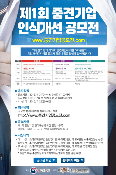 공모기간은 오는 24일 오후 5시까지이며 중견기업 인식개선 공모전 홈페이지에서 접수할 수 있다.