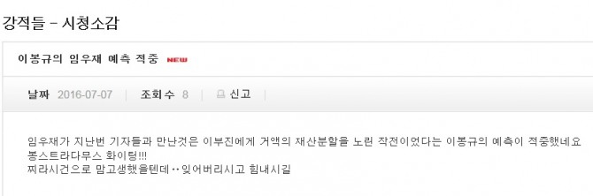 임우재 덕분에 이봉규 살았다는데...이부진 재산분할 소송 예측 적중에 "봉스트라다무스" TV조선 시청자 게시판 박보검 송중기 찌라시는 그만